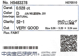 0.528ct, Dカラー, SI-1, VERY GOOD, 中央宝石研究所 |