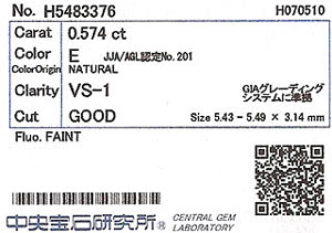 0.574ct, Eカラー, VS-1, GOOD, 中央宝石研究所 |