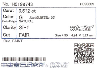 0.512ct, Gカラー, SI-1, Fair, 中央宝石研究所 |