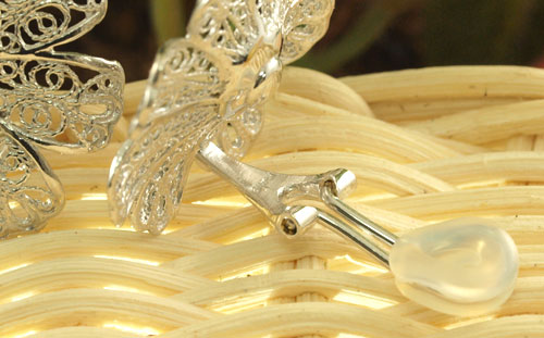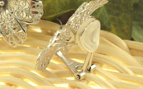 | ●とても上品なイメージです。 ●平戸銀線細工のようにも、アンティークジュエリーのようにも感じていただけると思います。 ●オリエンタルのような、アラベスクのような、和のような、無国籍な感じすら受けます。 ●仕様は使いやすいクリップ式。イヤリングですのでピアスのように耳たぶに穴が開いていなくてもご利用頂けます。 ●滑り止めに、シリコンゴムのストッパーを付けています。これでイヤリング特有の使用時の「痛さ」と「滑りやすさ」を軽減できると思います。 |