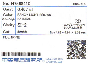 | 製品名 | 天然ブラウンダイヤモンド ルース(裸石) 0.467ct,SI-2,Fancy Light Brown (ファンシー・ライト・ブラウン) 【 中央宝石研究所ソーティング袋付】 |
