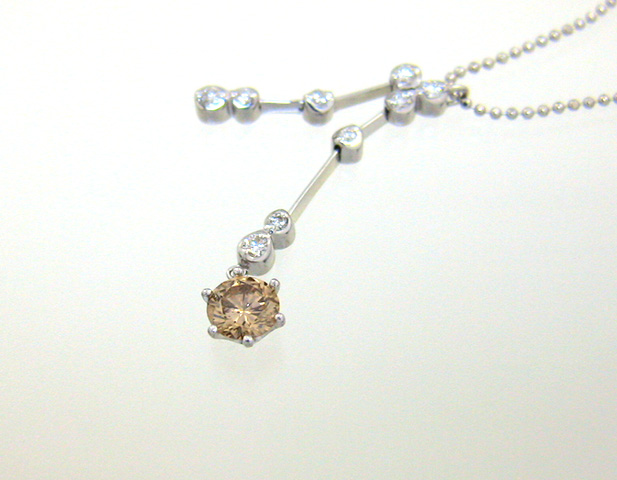 | ●最高品質のブラウンダイヤモンドは、別名『コニャックダイヤモンド』、『シャンパンダイヤモンド』と賞賛されることがあります。 ●上記のブラウンダイヤモンドは、そこまでの色合いはかもし出していませんが、お求めやすい価格設定となっており、気軽に楽しむことができると思います。。 ● 縦のラインを重視したデザインですので、胸元をすっきりと見せてくれます。パーツパーツでスイングするので、遊び心も満足! ・セミオーダーを見る ・婚約指輪の選び方を見る ・ブラウンダイヤモンド(販売中) ・ブラウンダイヤ(販売済み) ・カラーダイヤの詳しい説明を見る |