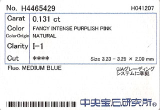 | カラー | Fancy Intense Purplish Pink (ファンシー・インテンス・パープリッシュ・ピンク) |