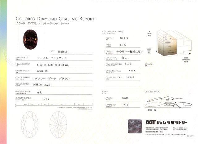 | ●ナチュラルのブラウンダイヤモンドです。 ナチュラルとは、ダイヤモンドそのものもカラーも、全て天然で本物であると鑑定されたダイヤモンドのことを言います。 ●『Dark』の評価ですがまあまあテリがあります。それよりも、角度や光源によって、レッディッシュ(赤色味)の光を放つときがあります。レッディッシュ・オレンジッシュ・ブラウンなんて評価は無いのかもしれませんが、そんな表情を魅せてくれます。。 ●0.650ctと大きさは十分。色の濃さを活かし、ボリュームのあるデザインで作ると、結構楽しめると思います。「お上品」よりは「活発」なデザインが面白いと思います! でも、ブラウンの落ち着きを活かして、アンティークっぽく作っても面白いかも・・・。 結局、どちらがいいんでしょう(笑)こんな悩みも楽しいですよ~! ●クラリティ評価が「SI-2」ですので、ダイヤの内外部に微細な内包物や欠けがあり、肉眼でも見えるときがあります。 ●リングやペンダント、またこだわりのエンゲージリング(婚約指輪)への加工も承ります(別料金)。 キーワードから見る>> ・ブラウンダイヤモンド(販売中) ・ブラウンダイヤ(販売済み) ・ルース ・セミオーダー |