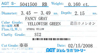| カラー | Fancy Gray Yellowish Green ファンシー・グレー・イエローイッシュ・グリーン Chameleon (カメレオン) |