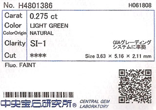 | カラー | Fancy Light Yellowish Green ( ファンシー・イエローィッシュ・グリーン ) GIA Light Green ( ライト・グリーン ) CGL |