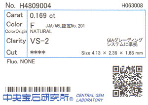 製品名【 レクタングラー・ステップ・カット 】天然ダイヤモンドルース(裸石) 0.169ct, VS-2, Fカラー【 中央宝石研究所ソーティング袋付 】