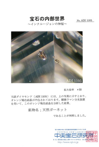 ![]() ▲ダイヤモンドの下部、時計で言うと5時~6時の辺りにあるのが、ガーネットの結晶です。眼の良い方ですと肉眼で点状のガーネット結晶をご覧頂けると思います。 |