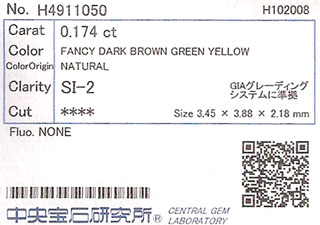 | カラー | Fancy Dark Brown Green yellow (ファンシー・ダーク・ブラウン・グリーン・イエロー) |