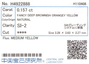 | カラー | Fancy Deep Brownish Orangy Yellow ( ファンシー・ディープ・ブラウニッシュ・オレンジー・イエロー ) |