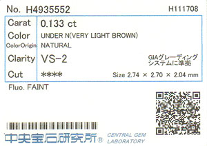 | 製品名 | 【 Under N (Very Light Brown) カラー 】 天然ダイヤモンド ルース(裸石) 0.133ct, VS-2 【 中央宝石研究所ソーティング袋付 】 |