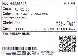 | クラリティ | I-1 ガーネット結晶と思われる他宝石をピンクダイヤ内部に含んでいます。 |