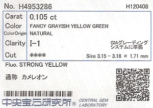 | カラー | Fancy Grayish Yellow Green ファンシー・グレイッシュ・イエロー・グリーン Chameleon ( カメレオン ) |