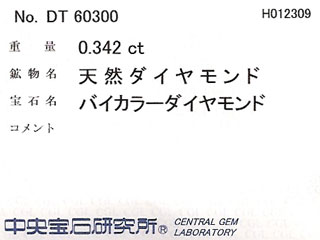 ![]() ▲正面画像 少し撮影の角度を変えました。やはり、はっきりと色の違いが判る『バイカラーダイヤモンド』です。 |