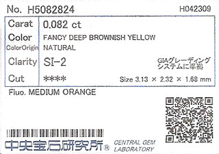 製品名イエローダイヤモンド ルース 0.082ct 【蛍光性がミディアム・オレンジ】のレアダイヤ 【中央宝石研究所ソーティング袋付】