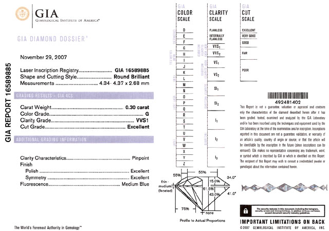 | 鑑定機関 | GIA ( GIA REPORT 16589885 ) GIAが提供している「GIA Report Check」サービスにより、このダイヤモンドの鑑定結果はWEB上で確認できます。 GIA Report Check ( 英文 ) ガードル部分に「GIA 16589885」とレーザー刻印しています。 |