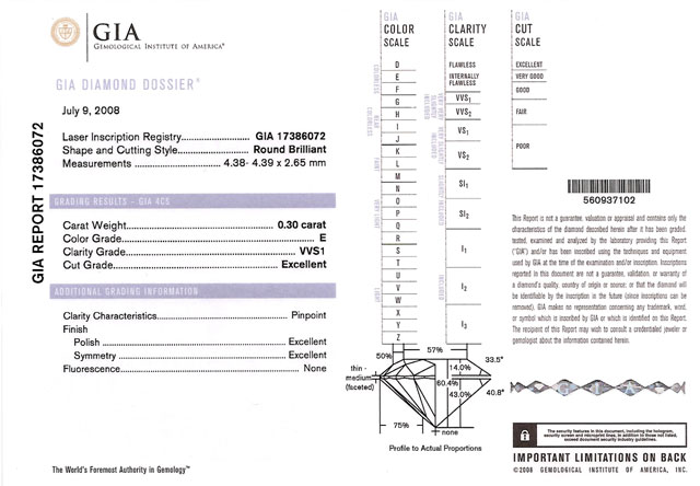 | 鑑定機関 | GIA ( GIA REPORT 17386072 ) GIAが提供している「GIA Report Check」サービスにより、このダイヤモンドの鑑定結果はWEB上で確認できます。 GIA Report Check ( 英文 ) ガードル部分に「GIA 17386072」とレーザー刻印しています。 |