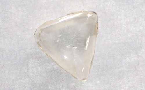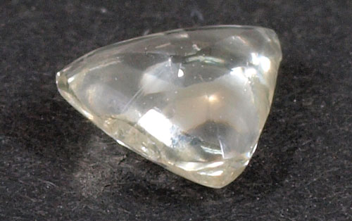 ![]() ▲正面画像 ほぼ正三角形の綺麗なマクル・・・ダイヤモンド原石。表面にはトライゴンがあまり無く、平らな滑らかな感じです。 |