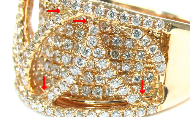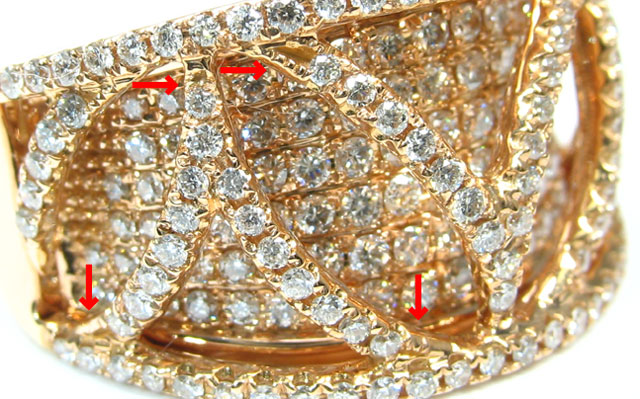 一番右の画像は、下段の端のほうはメレダイヤを留めていないことをご案内する画像です。元々留めておりません。ピンクゴールドで小さな泡玉のような仕上げにしていますので、ダイヤが留まっているのかなと錯覚(笑)する仕上げです。