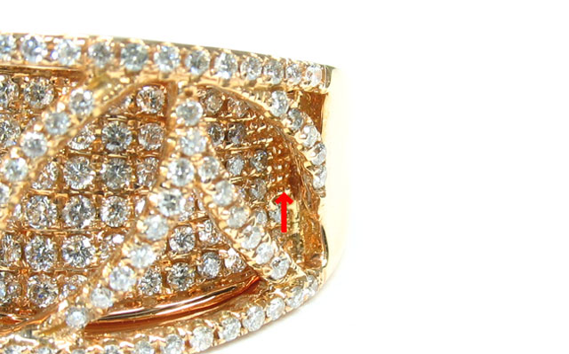 上記の画像のように、隙間のようなものが開いている部分がございます。まるでメレダイヤが外れてしまっているかのようにも見えますが、元々メレダイヤを留めてはおりません。