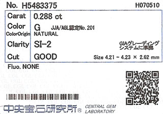 0.288ct, Gカラー, SI-2, GOOD, 中央宝石研究所 |