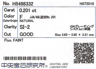 0.201ct, Fカラー, SI-2, GOOD, 中央宝石研究所 |