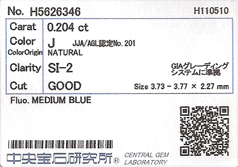 0.204ct, Jカラー, SI-2, GOOD, 中央宝石研究所 |