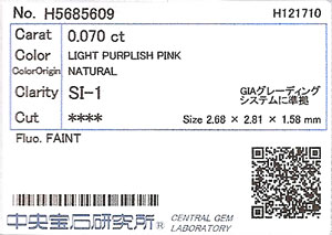 | 製品名 | ピンクダイヤモンド ルース 0.070ct, Light Purplish Pink, SI-1, Heart Brilliant |