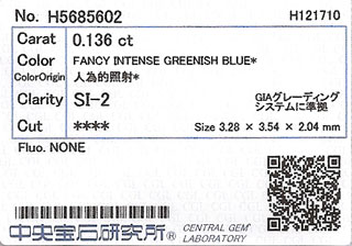 | カラー | Fancy Intense Greenish Blue ( ファンシー・インテンス・グリーニッシュ・ブルー ) |