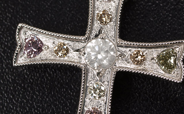 ●埼玉県にお住まいのお客様(女性)にペンダント・ネックレスに加工してお届けいたしました。数年以上かけて全10ピースのダイヤ/カラーダイヤを集め、ペンダントに仕上げました。左右両端のハートシェイプダイヤの形状に合わせたデザインなど、こだわりにこだわり、完全手作りにてお作りいたしました。画像では判らないと思いますが、贅沢にプラチナを使い、手にしたときの重量感に満足度をお感じいただけると思います。地金:プラチナ900