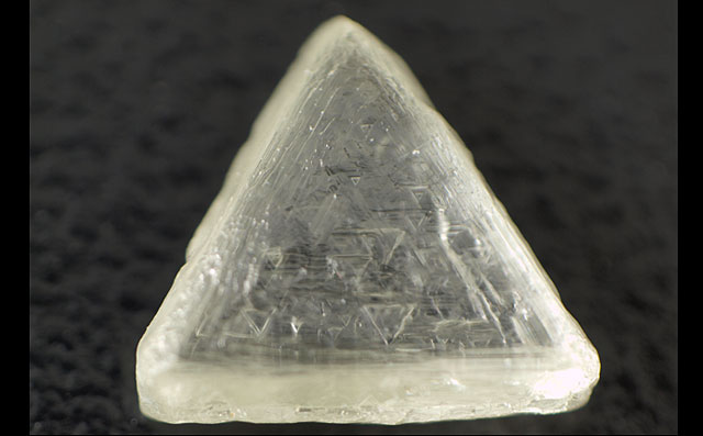 ![]() ▲正面画像 ほぼ正三角形の綺麗なマクル・・・ダイヤモンド原石。表面には大小さまざまなトライゴンが沢山確認できます。 |