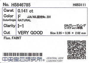 | 製品名 | ダイヤモンド ルース 0.141ct 【グリーンダイオプサイドと思われる結晶入り】 |