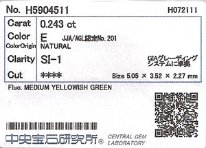 製品名ダイヤモンド ルース 0.243ct, Eカラー 【蛍光性がミディアム・イエローイッシュ・グリーン】【中央宝石研究所ソーティング袋付】