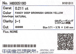 | カラー | Fancy Deep Brownish Green Yellow ( ファンシー・ディープ・ブラウニッシュ・グリーン・イエロー ) | |||||||||||||||||||||||||||||||||||