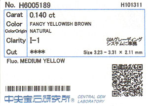 製品名天然ブラウンダイヤモンド ルース(裸石) 0.140ct 蛍光性が「ミディアム・イエロー」 【中央宝石研究所】