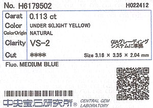 | 製品名 | スター型(五芒星)イエローダイヤモンド ルース 0.113ct Light Yellow VS-2 中央宝石研究所ソーティング袋付 |