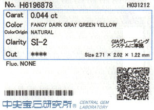 | 製品名 | グレイ・グリーン・イエローダイヤモンド ルース 0.044ct 【Fancy Dark Gray Green Yellow】【綺麗な涙型】【中央宝石研究所】 |