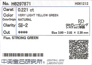 | 製品名 | 天然グリーンダイヤモンド ルース 0.221ct 【蛍光性が Strong Green】【中央宝石研究所ソーティング袋付】 |
