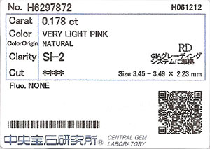 | 製品名 | 天然ピンクダイヤモンド ルース(裸石) 0.178ct, ベリーライトピンク 【 中央宝石研究所ソーティング袋付 】 |
