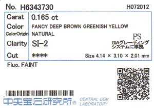 | カラー | Fancy Deep Brown Greenish Yellow (ファンシー・ディープ・ブラウン・グリーニッシュ・イエロー) |