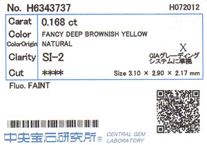 | カラー | Fancy Deep Brownish Yellow ( ファンシー・ディープ・ブラウニッシュ・イエロー ) |