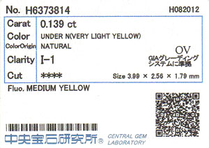 | 製品名 | 【 Under N (Very Light Yellow) カラー 】 天然ダイヤモンド ルース(裸石) 0.139ct, I-1,オーバルカット 【 中央宝石研究所ソーティング袋付 】 |