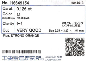 | 製品名 | Mカラーダイヤモンド ルース 0.126ct 【蛍光性はストロングオレンジ(Strong Orange)】 |