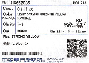 | 製品名 | 天然カメレオンダイヤモンド ルース(裸石) 0.111ct (天然イエローダイヤモンド) |
