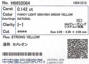 | 製品名 | 天然カメレオンダイヤモンド ルース(裸石) 0.142ct (天然イエローダイヤモンド) |