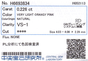 製品名天然ピンクダイヤモンド ルース(裸石) 0.226ct 【 タイプ2-a型のレアピンクダイヤ 】 【 中央宝石研究所 】
