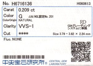 | 製品名 | 57面体カット 天然ダイヤモンド ルース(裸石) 0.209ct, Gカラー, VVS1 【 中央宝石研究所ソーティング袋付 】 |