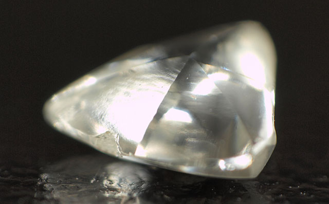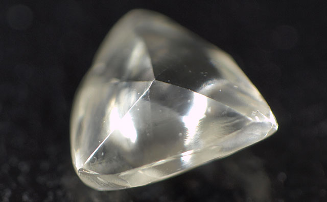 ![]() ▲蛍光性画像 黒い紙などの上に置いて、ブラックライトにあて、部屋を暗くするとこのような鮮やかな蛍光性を示します。 ![]() ▲正面画像 ほぼ正三角形の綺麗なマクル・・・ダイヤモンド原石。(立体感があるので、画像ではわかりづらいですが…。) |