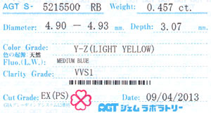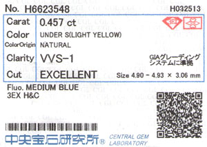 | 製品名 | 【 Y-Zカラー 】 天然ダイヤモンド ルース(裸石) 0.457ct, VVS-1, 3EX, H&C 【 AGT 中央宝石研究所 】 |