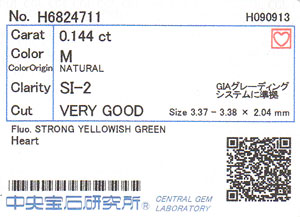 | 製品名 | 天然ダイヤモンド ルース 0.144ct 【 Mカラー、ハート 】【蛍光性がストロング・イエローイッシュ・グリーン】【中央宝石研究所】 |